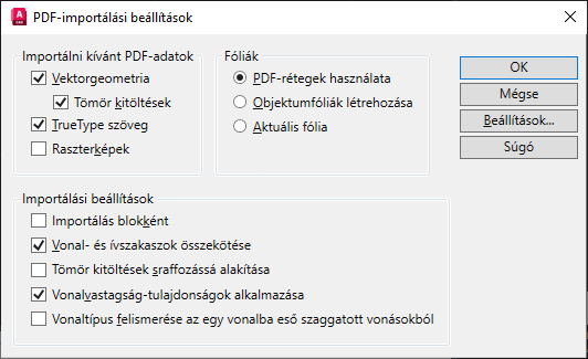 Megadja egy adott PDF-fájlból származó geometria, kitöltések, raszterképek és TrueType szövegobjektumok importálási beállításait.