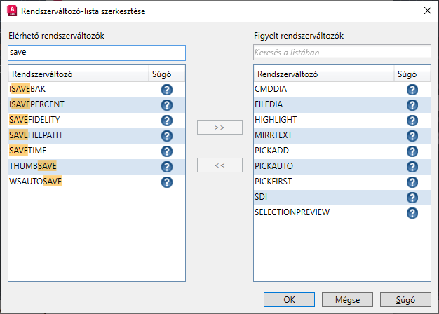 A bal oldalon található a megfigyelhető összes rendszerváltozó. A jobb oldalon találhatók a már megfigyelt rendszerváltozók. Kattintson egy rendszerváltozó neve mellett a ? jelre a hozzá kapcsolódó súgó témakör megnyitásához.
