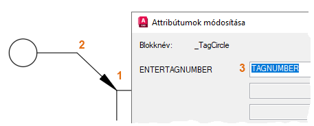 A végpont tárgyraszter használatával kattintson a téglalap valamelyik sarkába a nyílfej helyének megadásához (1). Ezután kattintson a mutató vízszintes mutatóvégének helyére (2), írjon be egy betűt vagy számot az Attribútumok szerkesztése párbeszédpanelen (3), majd kattintson az OK gombra.