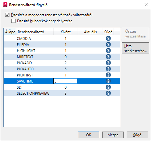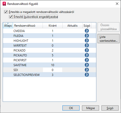 A parancspromptba írja be: RENDSZERVÁLTFIGYELŐ. A Rendszerváltozó-figyelő párbeszédpanelen láthatja a jelenleg megfigyelt rendszerváltozókat.