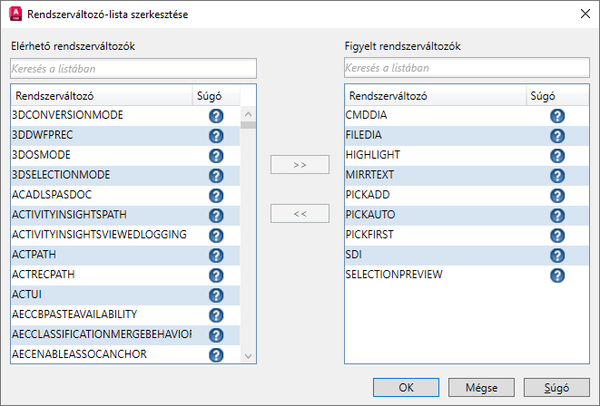 A bal oldalon található a megfigyelhető összes rendszerváltozó. A jobb oldalon találhatók a már megfigyelt rendszerváltozók. Kattintson egy rendszerváltozó neve mellett a ? jelre a hozzá kapcsolódó súgó témakör megnyitásához.