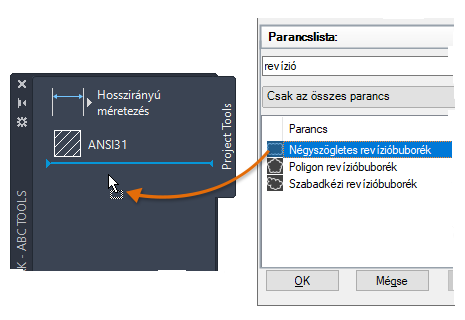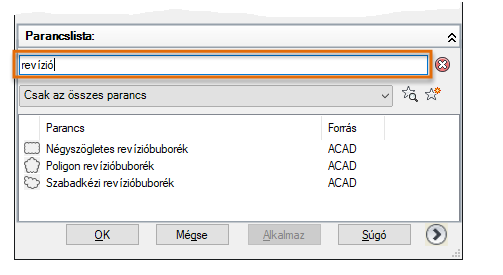 A Felhasználói felület testreszabása (CUI) szerkesztő Parancslista panel területén kattintson a Keresés a parancslistában mezőbe, és írja be a következőt: revízió.