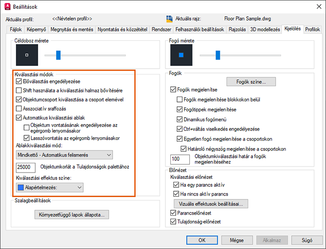 Számos beállítás lehet hatással az objektumok kiválasztására.