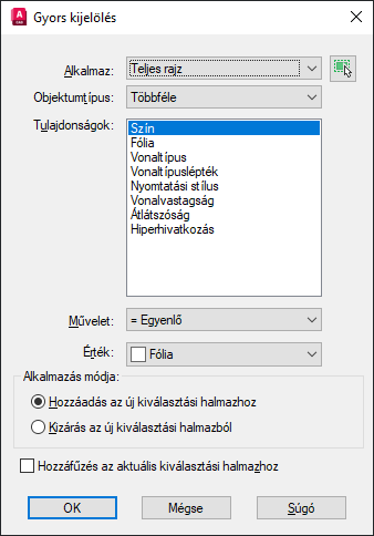 Megtalálja az összes olyan objektumot azon az aktuális rajzon, amelynek tulajdonságai egyeznek a kijelölt objektumokéval, majd hozzáadja őket a kiválasztási halmazhoz.