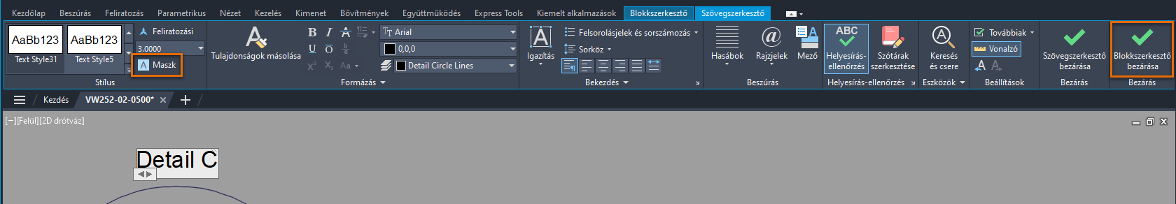 Ha a blokk meg van nyitva a Blokkszerkesztőben, kattintson duplán a Detail C (C részlet) bekezdéses szövegobjektumra a bekezdéses szövegek helyi szövegszerkesztőjében való szerkesztéséhez.
