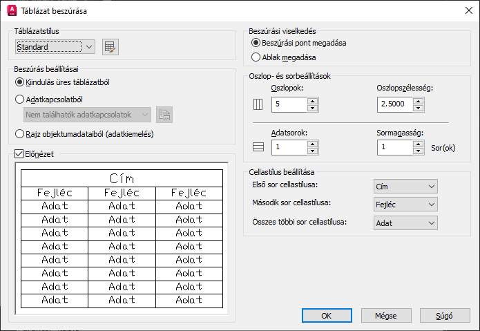 A táblázat készítéséhez válasszon ki egy stílust az aktuális rajz táblázatstílusai közül. A lenyíló lista mellett található gombra kattintva új táblázatstílust készíthet.