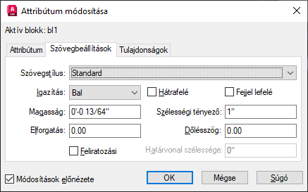 Beállítja azokat a tulajdonságokat, amelyek meghatározzák az attribútum szövegének a rajzban való megjelenését. Az attribútum szövegének színe a Tulajdonságok lapon állítható be.