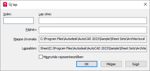Létrehoz egy új lapot az aktuális lapkészletben úgy, hogy létrehoz egy olyan rajzfájlt (DWG), amely tartalmaz egy, a rajzéval megegyező nevű elrendezés címkét.