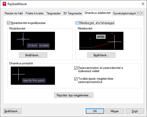 Mutatóbevitel, méretbevitel, dinamikus promptok és rajzolási tipp megjelenítése beállítások vezérlése.