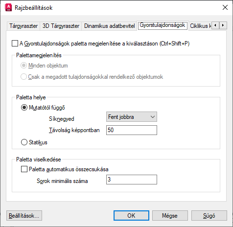 A Gyorstulajdonságok palettát jeleníti meg az objektumok kiválasztásakor, az objektumtípustól függően. (QPMODE rendszerváltozó)