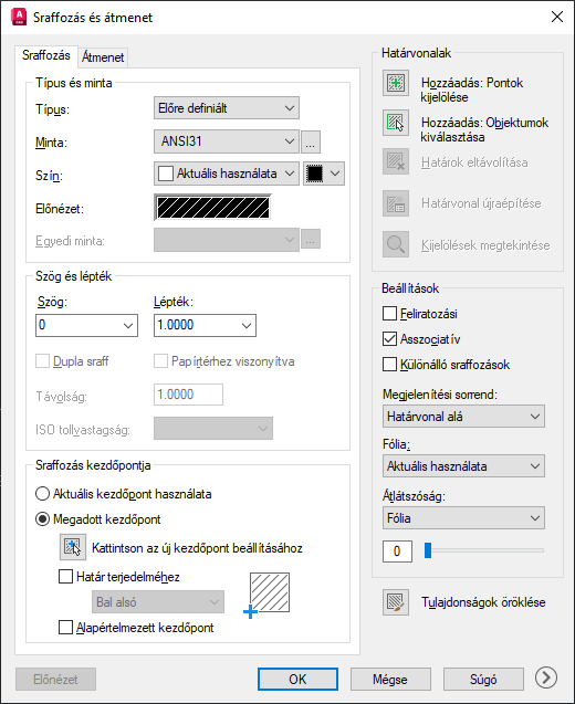 A Sraffozás és átmenet párbeszédpanelen két lapot és néhány közös beállítást tartalmaz, amelyek mindkét lapról elérhetőek.