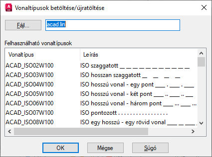 Megjeleníti az aktuális LIN-fájl nevét. Beírhatja egy másik LIN-fájl nevét, vagy kattintson a Fájl gombra egy fájl kiválasztásához a Vonaltípus fájl kiválasztása párbeszédpanelen.