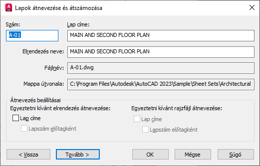 Ha be van jelölve, akkor a rajzfájl neve megváltozik: a lap számával kezdődik, és ezt követi a lap címe.