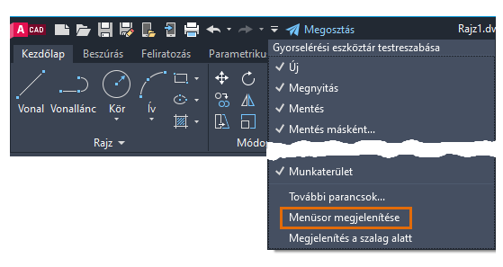 A menüsor a Gyorselérési eszköztár legördülő menüjéből engedélyezhető, illetve a felhasználói kezelőfelület testreszabása révén a CUI parancs használatával.
