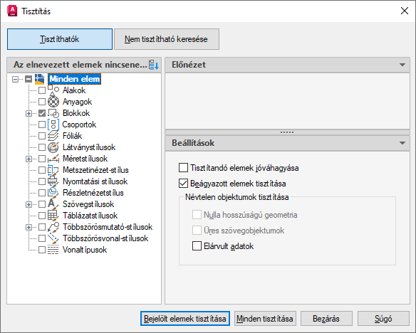 A bal oldalon lévő fa nézet ablaktáblában listaszerűen megjeleníti az aktuális rajzban található tisztítható elemeket. További elemeket távolíthat el a rajzból a párbeszédpanel jobb oldalán lévő Névtelen objektumok tisztítása ablaktábla alatt.