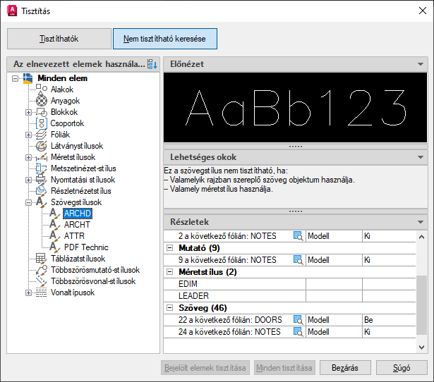 Ezek az elemek többnyire használatban vannak a rajzban, vagy alapértelmezett elemek, amelyek nem tisztíthatók. Az egyes elnevezett objektumokat kiválasztva információ jelenik meg arról, hogy a megjelenített objektum miért nem tisztítható.