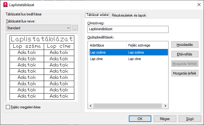 Lehetővé teszi a laplista táblázat oszlopfejeiben lévő címszöveg megváltoztatását.
