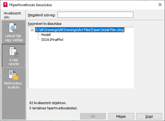 Megnyitja a Dokumentumon belüli hely megadása párbeszédpanelt, amelyben kiválasztható egy rajz elnevezett helye, amely a hiperhivatkozáshoz rendelhető.
