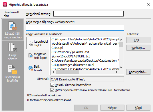 Relatív útvonalat alkalmaz a hiperhivatkozásokhoz. Ha az opció be van jelölve, a program a csatolt fájlhoz tartozó teljes elérési útvonalat nem menti a hiperhivatkozással. A relatív elérési útvonalat a rendszer a HYPERLINKBASE rendszerváltozó által megadott értékűre állítja be, vagy ha a HYPERLINKBASE rendszerváltozó értéke nincs megadva, akkor az aktuális rajz elérési útvonalára. Ha törli az opciót, a program a hozzárendelt fájlhoz tartozó teljes elérési útvonalat menti, a hiperhivatkozással együtt.