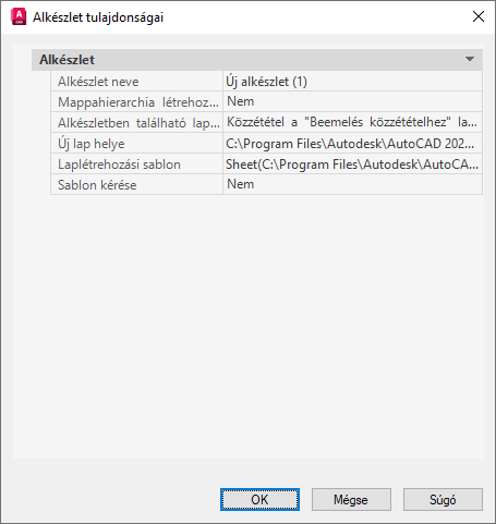 Megadja azt a rajzsablonfájlt (DWT) és elrendezésnevet, amelyet ebben az alkészletben az új rajzfájlok létrehozásához használunk.