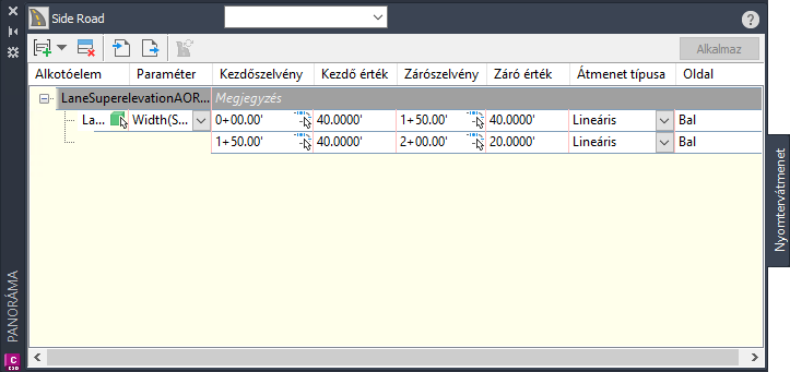 Válassza ki a rajzban az átmenethez használni kívánt alkotóelemet és az átvinni kívánt paramétert, majd válassza ki a szelvényeket, az értékeket és az átmenet típusát.