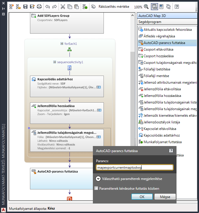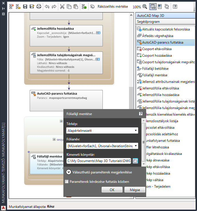 A munkafolyamat futtatásakor, a parancs rákérdez a DWG-fájl nevére és helyére. Ha kívánja, megadhatja ezeket a paramétereket a munkafolyamat részeként.