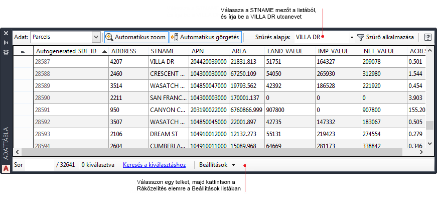 Megjeleníti az Adattáblát bármilyen fóliához. Szűkítse az Adattáblát, hogy a telkeknek csak egy része, jelen esetben a Villa Drive út mentén található telkek jelenjenek meg.
