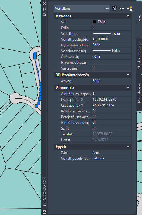 Tulajdonságok lehetőségre. A rózsaszín vonalláncok olyan telkeket jelölnek, amelyek objektumadatai címhez, területhez, értékhez stb. kapcsolódnak.