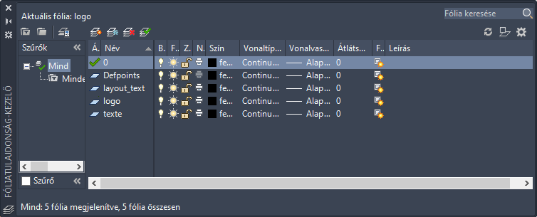 Láthatja a rajzban lévő fóliákat a tulajdonságaikkal együtt.