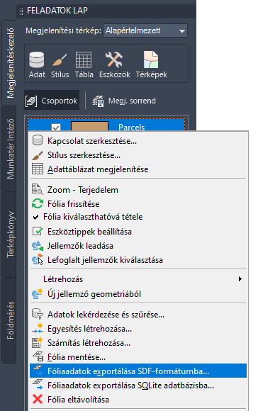 1. A Megjelenítéskezelőben kattintson a jobb gombbal a Telkek fóliára, és kattintson a Fóliaadatok exportálása SDF-formátumba parancsra.