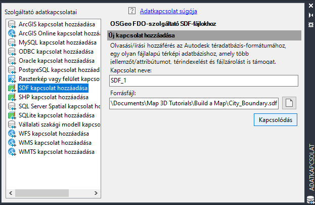 Jelölje ki az SDF szolgáltatót, és keresse meg a CITY_BOUNDARY.SDF nevű mintafájlt.