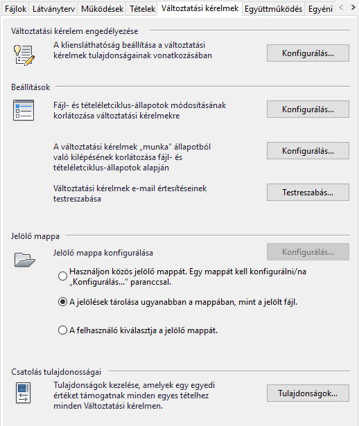 A Változtatási kérelmek lapon az életciklustól vagy állapottól függően változtatási kérelmekre korlátozhatja a tételek módosításait, beállíthatja a jelölők mappáját, kezelheti a változtatási kérelmek hivatkozásainak tulajdonságait és egyéni számozási sémákat határozhat meg változtatási kérelmekhez. A Változtatási kérelmek funkciót le is tilthatja.
