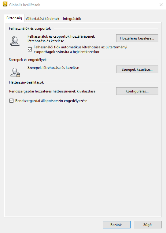 A Globális beállítások Biztonság lapja a Vault tárhoz való felhasználói hozzáférés biztosításához és a felhasználói jogosultságok hozzárendeléséhez biztosít lehetőségeket. Felhasználói csoportokat is létrehozhat, valamint hozzáférési jogosultságokat és szerepköröket rendelhet a csoportokhoz. A felhasználóhoz vagy a csoporthoz rendelt szerepkörök határozzák meg a felhasználó vagy a csoport tagjainak jogosultságait.