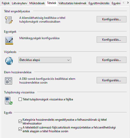 A Vault beállítások párbeszédpanel Tételek lapján konfigurálhatja a mértékegységeket, kezelheti a vízjelezési beállításokat, beállíthatja a DBJ-sorok opcióit és engedélyezheti, hogy a tételek tulajdonságokat írjanak vissza a társított fájlokba. A tételek funkciót le is tilthatja.