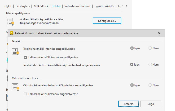 - A Tétel engedélyezése részen kattintson a Konfigurálás gombra. A Tételek engedélyezése és a Változtatási kérelmek párbeszédpanel különböző lehetőségeket kínál fel a Tételek funkció elérésének szabályozásához.