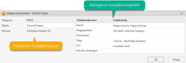 Az Általános tulajdonságok hálója statikus definíciókkal, címkével és egy tartalomvezérlővel rendelkezik, amely egy Vault tulajdonsághoz van kötve, és a párbeszédpanel definíciós fájljába menti a rendszer. A Dinamikus háló egy üres hálóobjektum, amely automatikusan ad hozzá címkéket és értékmezőket egy elem (fájl, mappa, egyéni objektum) kategória kiválasztásán keresztül. Ez a két háló az Adatlapok létrehozása/szerkesztése (lásd az előző képet) és a részlet lapok Adatlapok területeinek fő elemei: