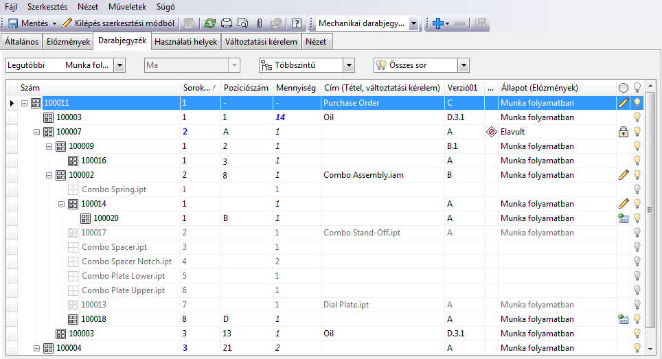 A DBJ hatékony kezeléséhez fontos a Darabjegyzék lap ikon- és állapotbeállításainak ismerete.