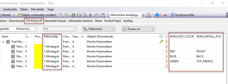 A példánytulajdonságok ugyanúgy működnek, mint a tételtulajdonságok előfordulásai a Vault darabjegyzékében (DBJ). Az azonos alkatrész-azonosítóval rendelkező elemeket a rendszer a példánytulajdonság értéke szerint csoportosítja.