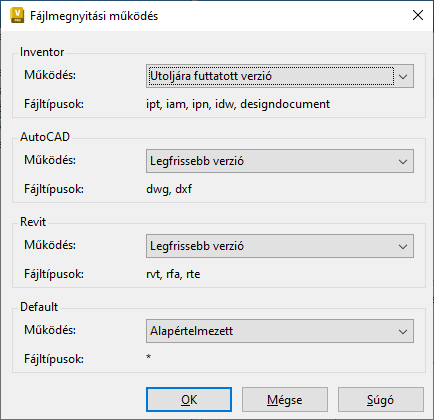 Meghatározhatja, hogy az Inventor, AutoCad és Revit fájlok megnyitása a legfrissebb verzióval, az utoljára futtatott verzióval, vagy a CAD alkalmazásnak abban a verziójában történik, amely utoljára mentette a fájlt.