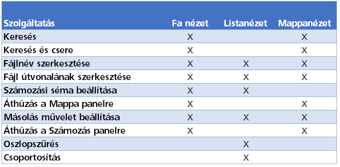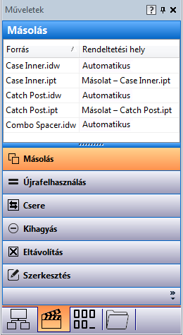 A Műveletek panel segítségével megtekintheti, hogy a fő nézetben található fájlokhoz milyen művelet van hozzárendelve. Miután konfigurálta a fájlokat a fő nézetben, a Műveletek ablakban szűrheti a fájlokat a hozzájuk rendelt művelet alapján. A hozzárendelt műveletek a következők lehetnek: másolt, újra felhasznált, lecserélt, kihagyott, szerkesztett. Megjegyzés: A fő rácsról áthúzhat fájlokat a kívánt művelet gombjára a Műveletek panelen, így beállíthat műveleteket.