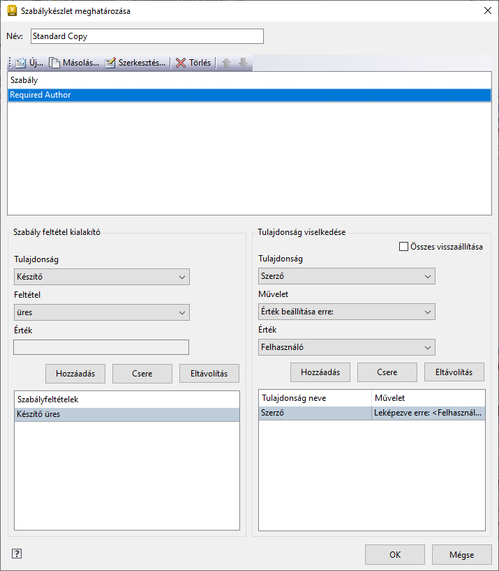 A Szabálykészlet meghatározása párbeszédpanelen lehet szabályokat létrehozni, szerkeszteni és törölni.