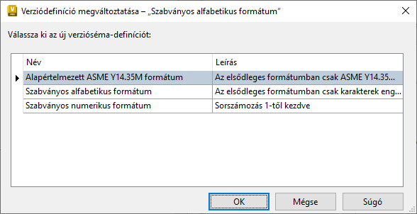 - A Verzióséma-definíció módosítása párbeszédpanelen válassza ki azon új verziósémát, amelyet hozzá kíván rendelni a kiválasztott tételhez. Kattintson az OK gombra.