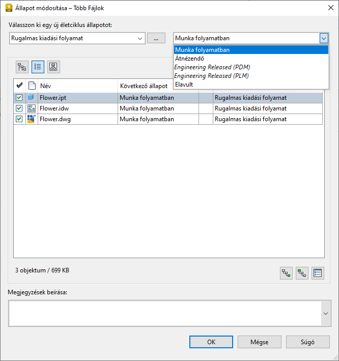 Ha például szeretné áthelyezni a rácsban található összes, Alapvető kibocsátási folyamat állapotú fájlt Munka folyamatban állapotba, akkor az életciklus-definíció legördülő szűrőjében az Alapvető kibocsátási folyamat opciót válassza. Ezen a ponton még nem történt változás a rácsban található állapotokban. Ezt követően válassza a Munka folyamatban opciót az életciklus-állapot legördülő menüből. A rácsban található összes fájl, mely Alapvető kibocsátási folyamat állapottal rendelkezik, átkerül Munka folyamatban állapotba.