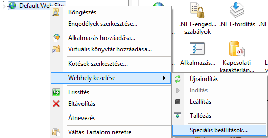 - Az Internet Information Services párbeszédpanelen bontsa ki a Helyi számítógép ► Helyek lehetőséget, majd kattintson a jobb gombbal az Alapértelmezett webhely elemre, és válassza a Kötések szerkesztése > Webhely kezelése > Speciális beállítások opciót.