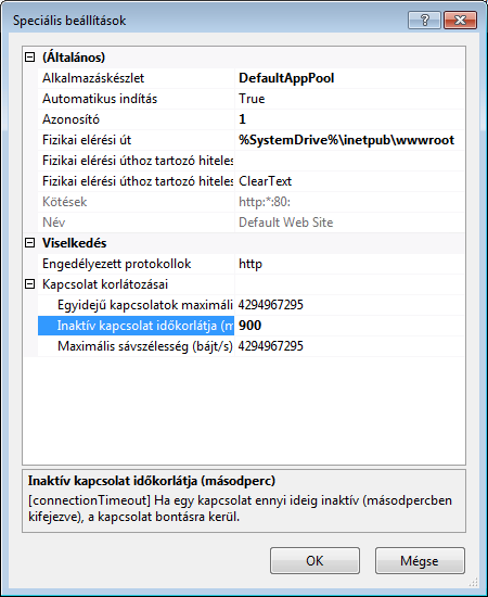 Ellenőrzi, hogy az IIS-kapcsolódás időtúllépési időtartama ne legyen korlátozó.