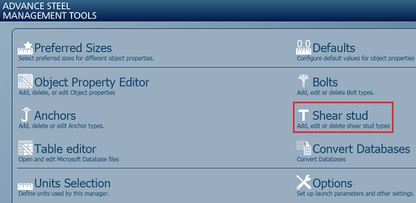 Learn how to customize shear studs in Advance Steel by using the Management Tools application to set default parameters for specific shear studs you then further use in your 3D model.