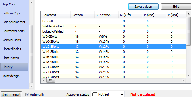 For connections that don't offer any out-of-the-box presets, or the preset is made on a completely new scenario, you can also add lines to the Library using the Save values button. A clear name in the Comment field is advisable for providing enough information during the modeling stage for detailers.