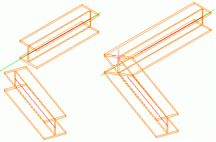 In a miter cut the intersection is created vertically or at the bisecting line. Each of the two beams gets a processing object at their end. The sections insertion axes must lie in the same plane. For sections that intersect, the longer parts are cut to miter.