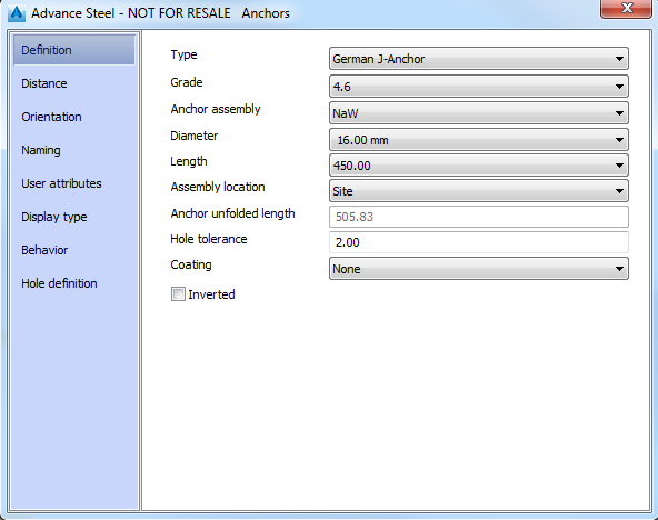 | Assembly location | Selects the anchor assembly location (site, site drill, shop). |