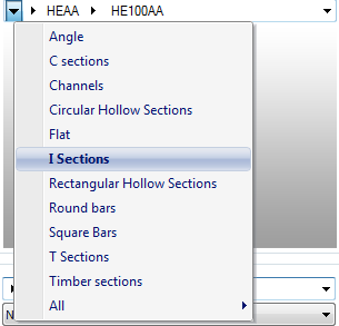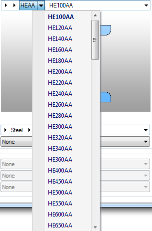 Allows you to select the beam section class, section type and size from the drop-down list displayed by clicking the corresponding arrow